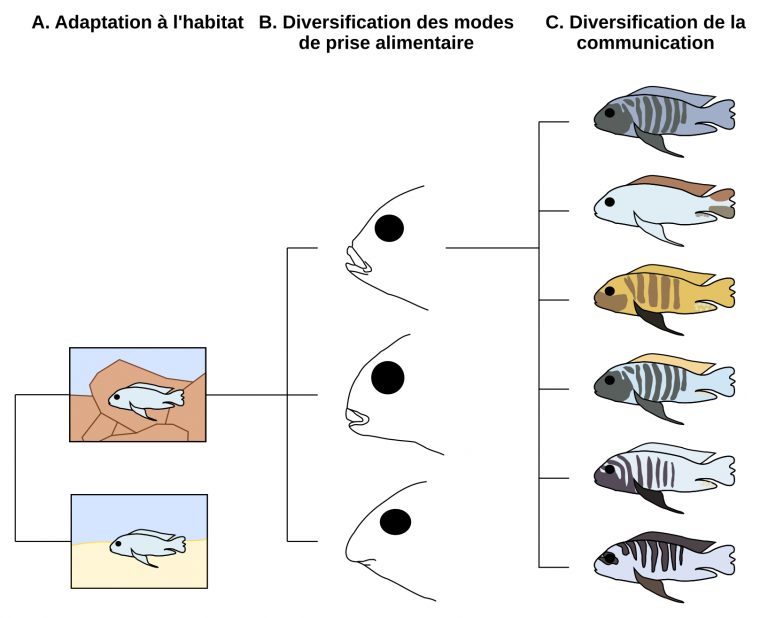 A. La première étape d’une radiation peut être l’adaptation à de nouveaux habitats (rocheux en haut, sableux en bas). B. Les morphologies trophiques peuvent alors se diversifier. C. Au sein du nouvel habitat, les signaux de communication, tels que la couleur, peuvent alors évoluer rapidement.