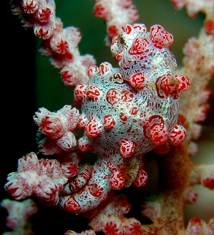 Hippocampus bargibenti, une espèce d’hippocampe dont les individus se fondent particulièrement bien dans l’environnement riche en gorgones. Cette adaptation correspond à une forme particulière de camouflage : le cryptisme, dans lequel un individu est peu visible.