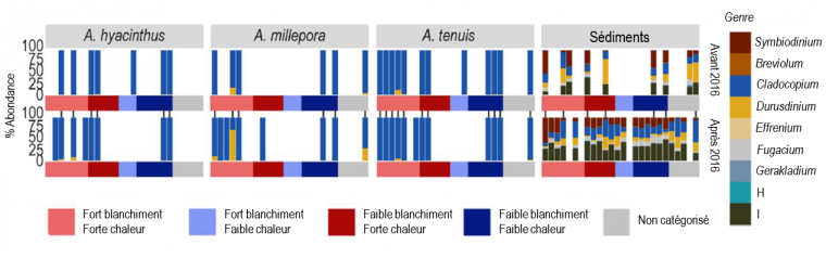 Enfin, selon les communautés symbiotiques en place, la quantité de chaleur nécessaire pour provoquer une même intensité de blanchiment varie. Par exemple les coraux A. tenuis qui n’étaient pas associés à des symbiotes du genre Durusdinium (tolérant la chaleur) ont subi un fort blanchiment alors que la quantité de chaleur accumulée était faible. Pour les coraux ayant subi un faible blanchiment malgré de fortes chaleurs, les communautés symbiotiques étaient très peu variables ce qui suggère des communautés résilientes. Le blanchiment est donc provoqué par la chaleur accumulée dans les eaux de surface, mais il est atténué ou accentué selon les communautés symbiotiques en place chez les coraux.