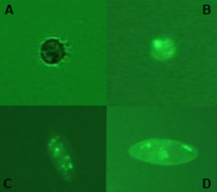 Le Cilié Halteria est mis au contact de Chlorovirus marqués par fluorescence. Observation en lumière visible (A) et après excitation fluorescente (B). Deux autres Ciliés, Euplotes sp. (C) et Paramecium caudatum (D), présentent également des agrégations de virus à l'intérieur de leurs vacuoles.