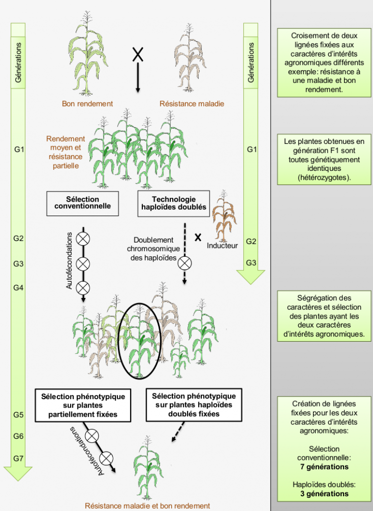 Une autre méthode pour obtenir des lignées fixées repose sur l’utilisation de plantes haploïdes doublées. Elle se base sur l’obtention de plantes haploïdes qui ne possèdent qu’un seul exemplaire de chaque chromosome (maternel ou paternel). L’application d’agents chimiques qui bloquent la division cellulaire permet de « copier-coller » chaque chromosome présent dans la plante haploïde, et donc d’aboutir à une plante dite haploïde doublée. La colchicine est un exemple d’agent chimique fréquemment utilisé qui bloque la métaphase de la mitose. Ce doublement chromosomique du génome haploïde permet donc la création rapide d’une lignée pure, puisque tous les gènes se trouvent en deux copies identiques, c’est-à-dire à l’état homozygote en deux générations seulement (Figure 1).