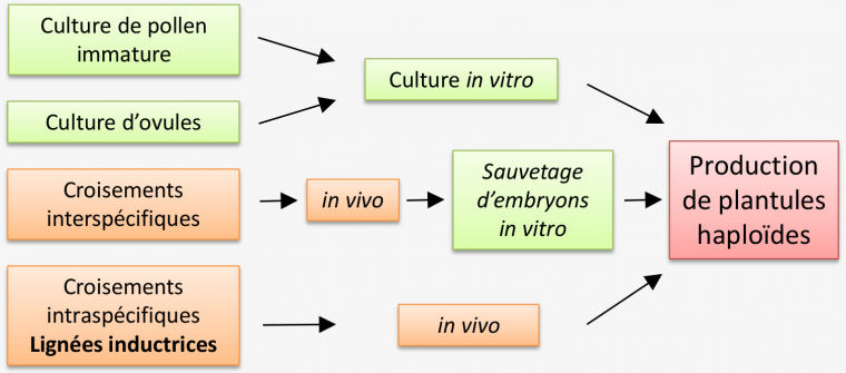 Plusieurs possibilités existent afin d’obtenir des plantes haploïdes (Figure 2). La méthode la plus fréquente repose sur la culture in vitro de tissus haploïdes, c’est-à-dire du gamétophyte mâle (pollen immature) ou femelle (sac embryonnaire). La culture in vitro permet de régénérer un embryon qui possède un génome haploïde, qui se développera en plante haploïde. Cela passe par la dédifférenciation du gamétophyte (mâle ou femelle) puis sa redifférenciation vers le stade embryon grâce à l’utilisation de cocktails d’hormones végétales et de conditions de culture in vitro particulières à chaque espèce et génotype. Il est aussi possible pour certaines espèces de réaliser des croisements interspécifiques, qui consistent à féconder l’oosphère de l’espèce d’intérêt avec le pollen d’une autre espèce. Les chromosomes paternels sont progressivement éliminés, mais ceci est suffisant pour déclencher un développement d’un embryon haploïde ayant uniquement les chromosomes maternels. Enfin, une autre possibilité pour la création in vivo de plantes haploïdes est l’utilisation de lignées particulières appelées « plantes inductrices ». Ce processus n’est pour l’instant connu que chez le maïs, car des plantes inductrices n’existent naturellement que chez cette espèce. Un croisement avec le pollen d’une lignée inductrice sur l’épi de n’importe quelle autre lignée (généralement non inductrice) entraîne le développement de l’oosphère en embryon haploïde. Les embryons ou plantules haploïdes doivent être doublés chimiquement pour donner des plantes haploïdes doublées contenant uniquement du matériel génétique de la plante mère. Cette induction d’haploïdes in vivo est un outil puissant de sélection car il requiert moins de travail, et donc un coût moindre, comparé aux systèmes qui nécessitent de la culture in vitro (Figure 2).