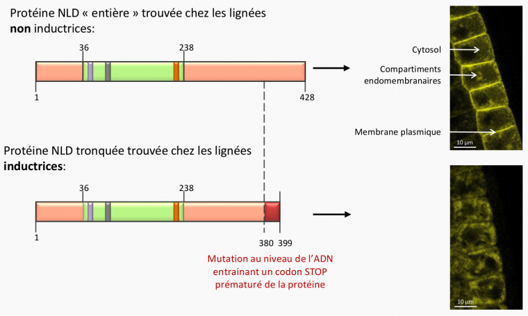 Ces plantes inductrices sont actuellement très largement utilisées comme outil dans les schémas de sélection du maïs afin de produire rapidement des lignées fixées. Cependant, les mécanismes cellulaires et moléculaires sous-jacents restent inconnus. Nos travaux de recherche, qui visent à comprendre comment un pollen provenant de plantes inductrices déclenche le développement d’une cellule œuf en embryon haploïde, nous ont récemment permis d’identifier un gène majeur intervenant dans ce processus (Gilles et al., 2017). Nous avons baptisé ce gène « Not Like Dad » (=NLD), ce qui se traduit par « pas comme papa », puisque l’information génétique du père ne se retrouve pas dans la descendance. Nous avons identifié une mutation dans ce gène qui est responsable de l’induction de plantes haploïdes (Figure 3). Cette mutation est présente dans toutes les lignées inductrices et absente dans toutes les autres lignées de maïs analysées. Une preuve de l’implication de ce gène NLD dans l’induction de plantes haploïdes a été apportée par l’expérimentation suivante : l’ajout du gène NLD intact à une lignée inductrice entraîne la perte de la capacité d’induction d’haploïde.