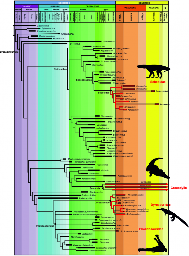 Apparus à la fin du Trias, les Crocodyliformes occupent dès le milieu du Jurassique quasiment tous les milieux, aussi bien marins que continentaux (Wilberg et coll., 2019). À la fin du Crétacé, existent trois grands clades : les Notosuchiens, les Téthysuchiens et les Eusuchiens. Ces trois groupes sont extrêmement différents, et tous les trois traversent la crise Crétacé-Paléogène (Fig. 1).