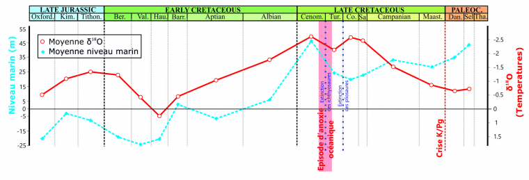 Pour bien comprendre l’évolution des Crocodyliformes, et des Reptiles en général, à travers la crise K-Pg, il faut remonter un peu en arrière pour bien comprendre l’état des différents groupes et leur dynamique lorsque celle-ci survient. Plusieurs phénomènes ont lieu tout au long du Crétacé supérieur. Un fort épisode anoxique (fin Cénomanien-début Turonien) touche les environnements marins, suivi d’une grande régression marine (baisse du niveau marin) au Turonien qui réduit considérablement la surface du plateau continental. La succession des deux phénomènes affaiblit considérablement les écosystèmes marins et en particulier les milieux côtiers (Fig. 5). Les écosystèmes fluviatiles semblent avoir eux aussi été indirectement affectés. Les Pholidosauridés, principalement côtiers et fluviatiles, en subissent les conséquences de plein fouet, et seuls quelques rares taxons survivront jusqu’à la fin du Crétacé. Le climat, très chaud au début du Crétacé supérieur, va ensuite se refroidir progressivement jusqu’au début du Paléogène, impactant considérablement des écosystèmes aquatiques déjà fragilisés, mais atteignant aussi les milieux terrestres. Cette dégradation climatique est probablement à l’origine de la baisse de diversité des Notosuchiens, dont une large partie est éteinte bien avant la crise K-Pg. Seule une partie des Sébécosuchiens (des grands prédateurs), atteignent et traversent la crise K-Pg, avec semble-t-il une radiation au Paléogène (Pol et Leardi, 2015). Les Dyrosauridés et Eusuchiens apparaissent quant à eux à la fin du Crétacé, et connaissent ensuite une lente diversification.
