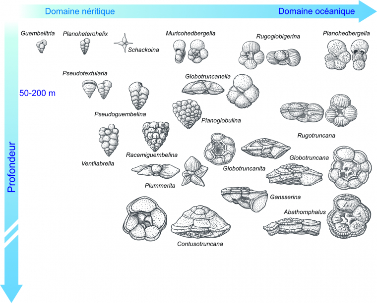 Au Crétacé supérieur, la distribution des foraminifères planctoniques dans la tranche d’eau est supposée similaire à celle observée dans les océans modernes, avec des formes globuleuses à morphologie simple en surface et des formes plus complexes, à une ou deux carènes, en profondeur (Figure 1). La carène est un bourrelet calcitique, présent sur la majorité des loges, et qui permettrait au foraminifère d’alourdir son test pour faciliter la plongée dans la tranche d’eau.