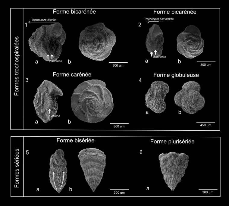 Au Maastrichtien supérieur, c’est-à-dire à la toute fin du Crétacé, les assemblages de foraminifères planctoniques aux basses latitudes sont particulièrement diversifiés. Cela se marque par une incroyable variété de formes (Figures 1 et 2). La fin du Crétacé compte ainsi parmi les intervalles de temps (avec la partie moyenne de l’Éocène) où la diversité des foraminifères planctoniques est la plus forte. Parmi les formes trochospiralées, c’est-à-dire dont la coquille s’organise en spirale non plane (Figure 2), existent des morphotypes globuleux (comme les genres Muricohedbergella ou Rugoglobigerina), des morphotypes à une seule carène (comme les genres Globotruncanita ou Gansserina) et d’autres à deux carènes (comme les genres Contusotruncana et Globotruncana). La présence de deux carènes est d’ailleurs une spécificité du Crétacé supérieur. C’est aussi l’intervalle de temps durant lequel les foraminifères planctoniques atteignent leur plus grande taille, avec Contusotruncana contusa qui pouvait mesurer jusqu’à un millimètre. Cette espèce présentant deux carènes est facilement reconnaissable à sa trochospire très élevée (Figure 2). Les assemblages de la partie terminale du Crétacé ont aussi la particularité de contenir de très nombreuses formes sériées aux morphologies multiples et, parfois, exubérantes (Figures 1 et 2). Parmi ces formes existent des genres bisériées1 (Planoheterohelix ou Pseudotextularia), des formes trisériées (Guembelitria) ou encore plurisériées (Racemiguembelina ou Planoguembelina).