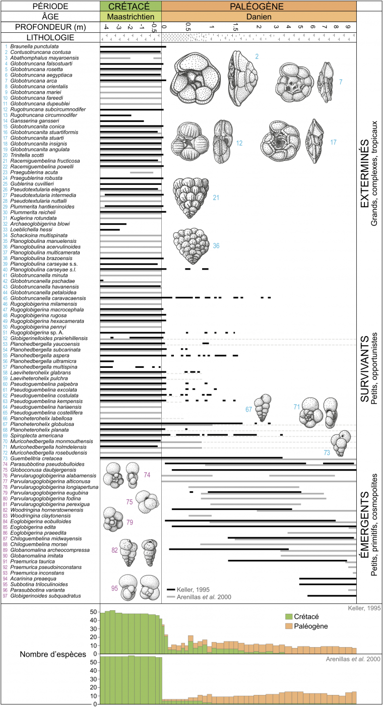 Les travaux sur les foraminifères planctoniques au passage Crétacé-Paléogène sont nombreux mais contrastent à la fois sur l’interprétation des modalités d’extinction (graduelle ou catastrophique) mais aussi sur le nombre d’espèces survivantes. En effet l’observation d’une espèce donnée dans des roches du Danien peut s’expliquer de deux façons : soit l’espèce était réellement présente à cette période (espèce survivante) soit son fossile, déposé au Maastrichtien, s’est retrouvé plus tard mélangé aux sédiments du Danien, par exemple à cause d’un phénomène de bioturbation (déplacement de sédiments sous l’action d’organismes vivants). Une difficulté pour les équipes de recherche est donc de discriminer les espèces survivantes des espèces remaniées.