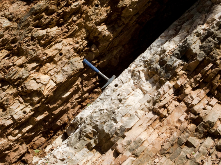 Sur le terrain, lorsque les coupes sont complètes, la limite Crétacé-Paléogène est souvent marquée par de brusques changements lithologiques ; les séries carbonatées sont ainsi interrompues par un fin niveau argileux, dépourvu de carbonates (crise des producteurs) et contenant l’anomalie en iridium. C’est notamment le cas pour la coupe de référence de la Contessa, située dans la région de Gubbio en Italie (Figures 3 et 4). Le nom de cette coupe est connu de tous les géologues car c’est sur ce site que les Alvarez, père et fils, accompagné de Frank Asaro et d’Helen Michel ont mis en évidence dans les années 1980 la fameuse anomalie en iridium, permettant d’avancer une origine extraterrestre pour expliquer la crise Crétacé-Paléogène.