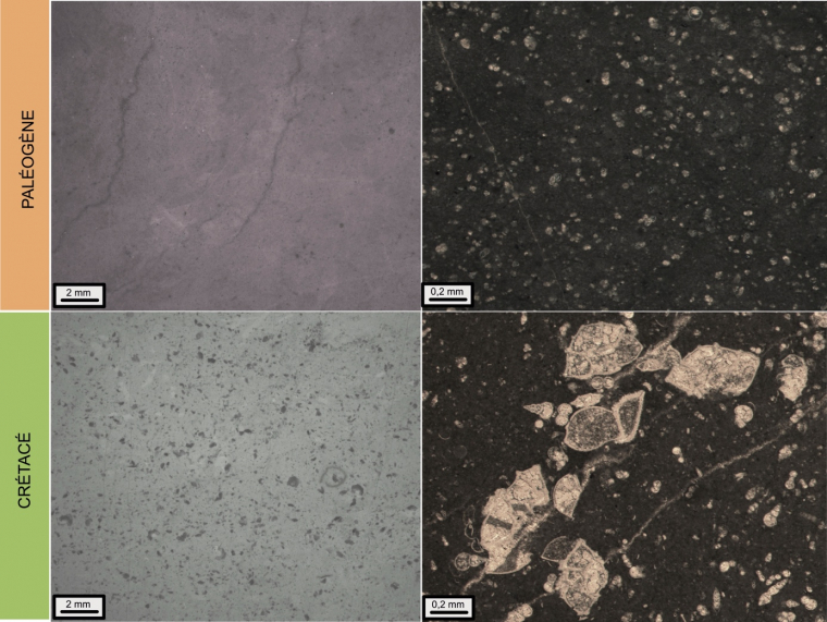 À la Contessa, une fine couche d’argiles sépare les calcaires rose clair de la fin du Crétacé des calcaires rose foncé du début du Paléogène. L’observation des calcaires à la loupe, de part et d’autre de la couche d’argiles, permet de visualiser l’impact de la crise sur les foraminifères planctoniques. Avec une loupe de terrain, ce que l’on observe est analogue à la première colonne de la figure 5. Ainsi dans l’échantillon crétacé, de nombreux petits grains sont visibles à la loupe. Ce sont des foraminifères planctoniques. Sans être spécialiste, on peut noter la variété de forme et de taille de ces grains qui rend compte de la diversité des assemblages de la partie terminale du Crétacé. Un centimètre au-dessus de la couche d’argiles, l’échantillon du Paléogène parait homogène et, on y perçoit difficilement quelques grains. En quelques centimètres seulement, les riches assemblages du Maastrichtien disparaissent brutalement. Ce constat est encore plus flagrant à fort grossissement, au microscope. L’observation des lames minces montre des foraminifères planctoniques qui sont jusqu’à 10 fois plus petits à la base du Danien (Figure 5).