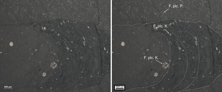 Cette lame mince illustre bien le remaniement de grandes formes crétacées (F. plc. K.) dans les sédiments paléogènes exclusivement composés de petits formes (F. plc. P.).