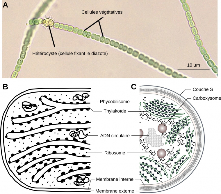 A. Filament de cyanobactéries du genre Anabaena. Les hétérocystes sont des cellules spécialisées dans la fixation du diazote N2. Elles sont plus grandes que les cellules végétatives qui, elles, réalisent la photosynthèse.