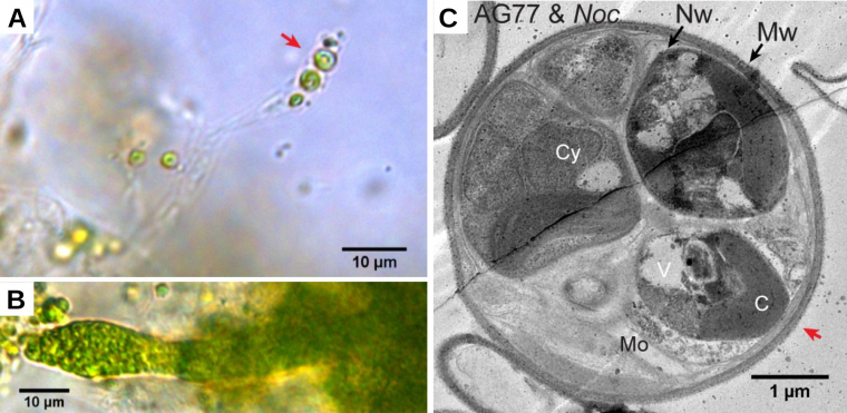 C. Observation en microscopie électronique à transmission d’une section transversale d’hyphe après un mois de coculture entre le champignon et l’algue. Mo : organites du champignon, Mw : paroi du champignon, Nw : paroi de l’algue, Cy, V et C : cytoplasme, vacuole et chloroplaste de l’algue.