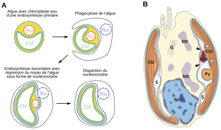 Chl : chloroplaste, G : appareil de Golgi, Mt : mitochondrie, N : noyau, Nm : nucléomorphe, Py, pyrénoïde (structure intraplastidiale permettant de concentrer le CO2 au voisinage de la Rubisco), S : grain d’amidon. Le nucléomorphe est situé entre la membrane externe du chloroplaste (têtes de flèche blanches) et la membrane périplastidienne (têtes de flèche noires)