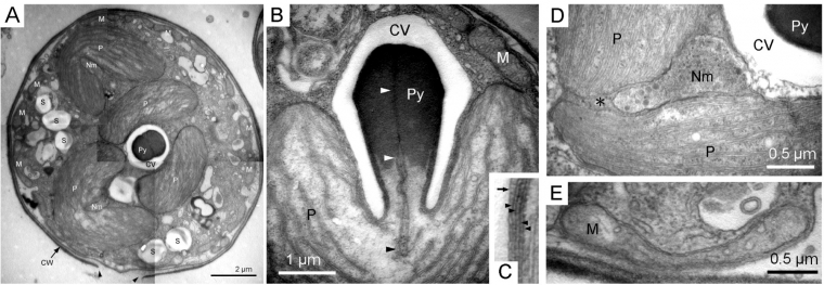 CV : vésicule coiffant le pyrénoïde ; CW : paroi ; M : mitochondrie ; Nm : nucléomorphe ; P : plaste ; Py : pyrénoïde ; S : vésicule de stockage de métabolites.