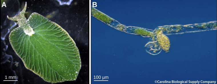 A. L’élysie émeraude (Elysia chlorotica) doit sa couleur verte aux plastes des algues Vaucheria sp.