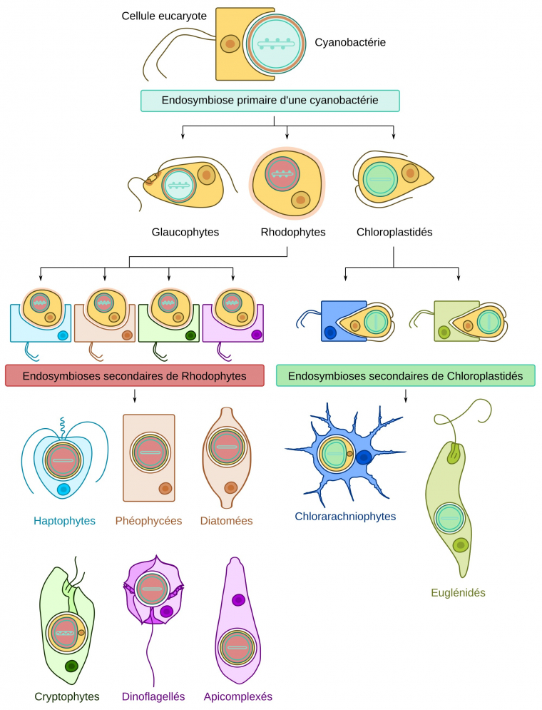 Des endosymbioses secondaires, soit de Rhodophytes, soit de Chloroplastidés, ont ensuite eu lieu dans différentes lignées d’Eucaryotes, représentées par des couleurs de cytoplasme et de membrane plasmique différentes. Ces événements d’endosymbiose secondaire ont logiquement conduit à des plastes à quatre membranes, les deux membranes les plus externes correspondant à la membrane d’endocytose ainsi qu’à la membrane de la cellule endocytée. Dans certains cas, le noyau de la cellule endocytée persiste sous forme de nucléomorphe (Cryptophytes et Chlorarachniophytes). Chez les Dinoflagellés et les Euglénidés, les plastes n’ont que trois membranes, ce qui pourrait s’expliquer par une perte de la membrane de la cellule endocytée. Par ailleurs, chez les Dinoflagellés, le plaste à trois membranes a été remplacé dans plusieurs lignées suite à d’autres événements d’endosymbiose secondaire, voire tertiaire, non représentés ici. Chez les Cryptophytes, les phycobilisomes ne se situent pas du côté du stroma, mais du côté du lumen des thylakoïdes. Chez les Apicomplexés, le plaste n’est pas photosynthétique. Dénommé apicoplaste, il est impliqué dans certaines biosynthèses.
