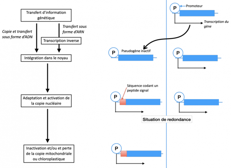 Les mécanismes de transfert génétique entre organites et noyau restent encore mal connus. Le modèle proposé par Marc-André Selosse implique plusieurs étapes : le passage de l’information génétique vers le noyau, la mise en fonctionnement de l’information génétique transférée et la réduction de l’information génétique de l’organite (Figure 15) 1.