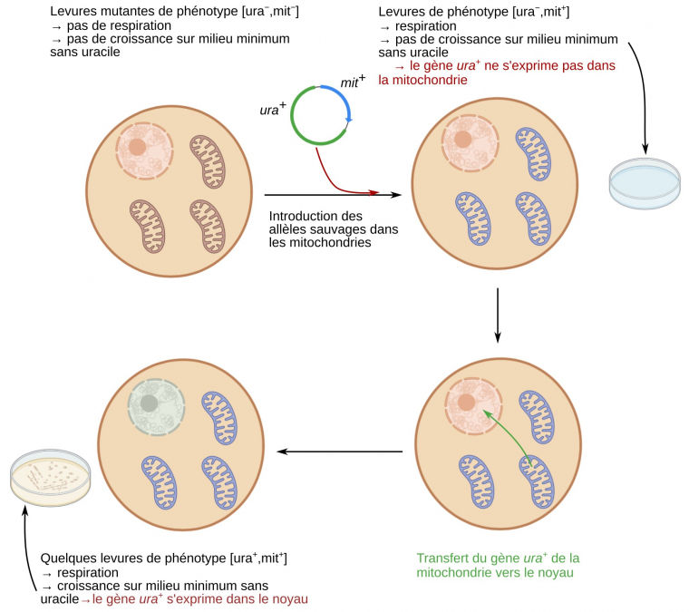 Enfin, de tels transferts horizontaux de gènes peuvent être mis en évidence expérimentalement chez la levure Saccharomyces cerevisiae (Figure 14). La démonstration en a été faite en utilisant une souche incapable de synthétiser l’uracile (car possédant la mutation nucléaire ura−) et incapables de respirer (car possédant la mutation mitochondriale mit−). À l’intérieur des mitochondries de ces levures, on introduit alors les séquences des allèles sauvages fonctionnels ura+ et mit+. Les levures transformantes sont capables de respirer, car l’allèle mit+ a été ajouté dans les mitochondries, là où il est normalement exprimé, mais la plupart d’entre elles ne produisent pas d’uracile, car l’allèle sauvage a été introduit dans les mitochondries alors que la production d’uracile nécessite que cet allèle soit exprimé dans le noyau. Cependant, en cultivant un grand nombre de levures de génotype (ura+, mit+) sur un milieu sans uracile, il est tout de même possible d’observer le développement de quelques colonies, qui sont donc de phénotype [ura+]. Chez la plupart de ces levures, la séquence ura+, introduite initialement dans les mitochondries, a été retrouvée au niveau du génome nucléaire où elle s’exprime. Ces expériences démontrent l’existence d’un transfert de gène, des mitochondries vers le noyau. De tels transferts sont fréquents, car les colonies [ura+] apparaissent avec une fréquence élevée, de l’ordre de 2.10-5 par génération.