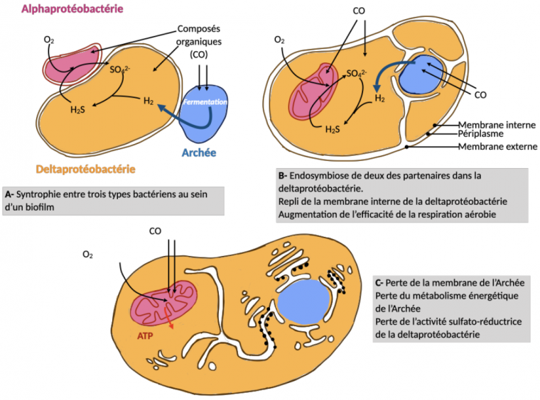 Au cours du temps, cette syntrophie tripartite serait devenue une symbiose obligatoire entre les trois partenaires et aurait conduit à une endosymbiose de l’archée et de l’alphaprotéobactérie dans la deltaprotéobactérie. L’archée constituerait le futur noyau, l’alphaprotéobactérie la future mitochondrie et la deltaprotéobactérie le futur cytoplasme de la cellule eucaryote.