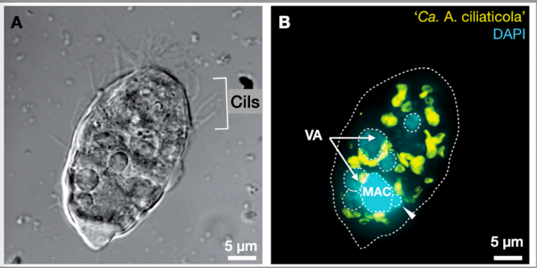 MAC : macronoyau, flèche blanche : micronoyau, VA : Vacuoles digestives. La bactérie endosymbiotique est colorée en jaune.