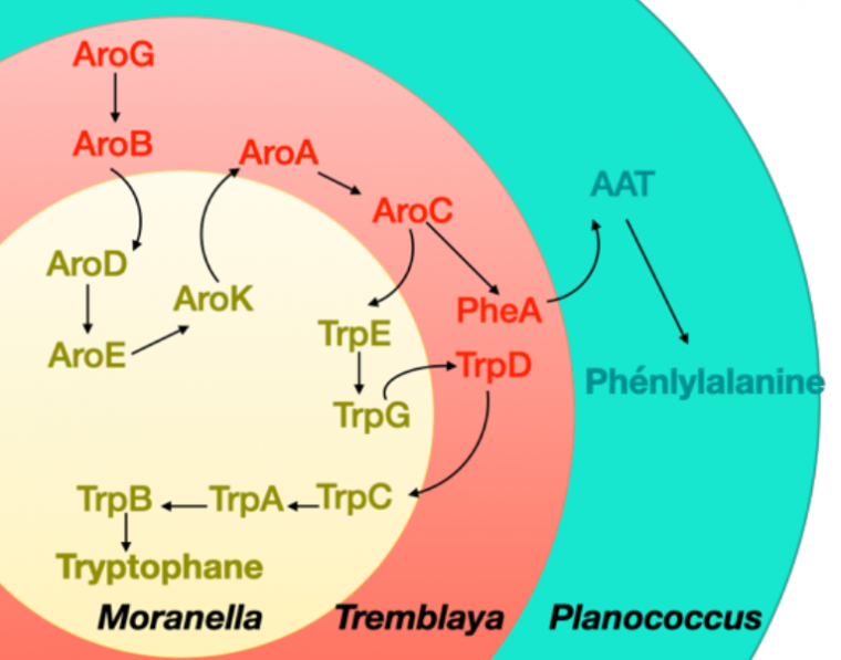 Des syntrophies tripartites peuvent être observées actuellement, comme celle unissant la cochenille farineuse du citronnier (Planococcus citri) à deux espèces bactériennes. Cette cochenille est un insecte piqueur-suceur qui cause des dommages notamment aux citronniers, aux bananiers et aux orchidées. Elle affaiblit la plante en prélevant sa sève élaborée et produit un miellat qui favorise le développement de champignons. La cochenille abrite non seulement la bactérie intracellulaire Candidatus Tremblaya princeps, mais aussi Candidatus Moranella endobia qui vit dans le cytoplasme de la première. Il y a donc une structure en poupées russes avec trois partenaires imbriqués l’un dans l’autre. Ces partenaires vivent en syntrophie car chacun possède une partie des enzymes nécessaires à la synthèse de deux acides aminés essentiels pour l’insecte : la phénylalanine et le tryptophane (Figure 5) 1.