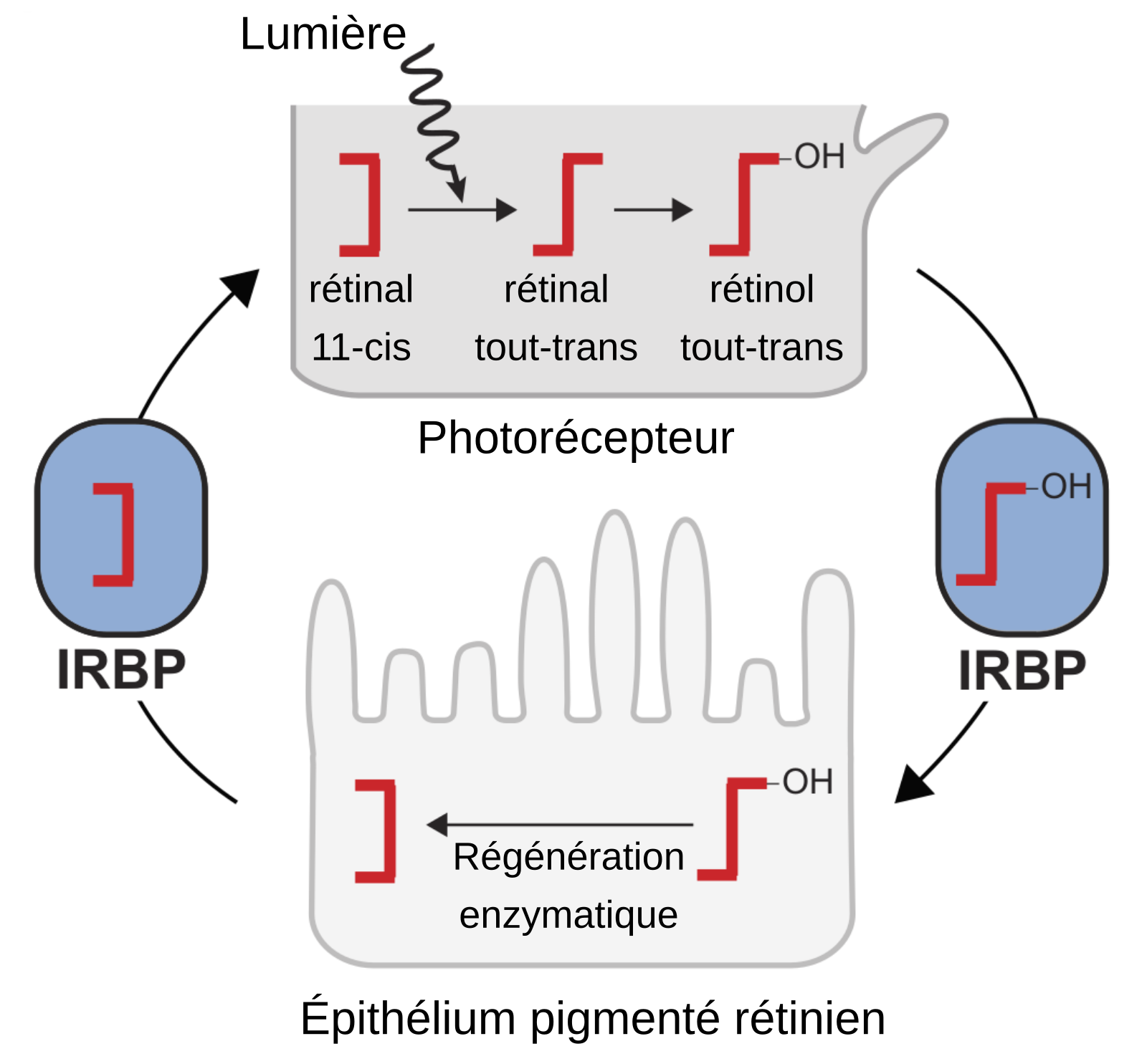 Parmi ces gènes, ils ont trouvé IRBP (pour Interphotoreceptor Retinoid-Binding Protein). Ce gène code une protéine qui est secrétée dans l’espace entre la rétine et l’épithélium pigmenté rétinien et qui permet le transport et le recyclage du rétinal tout-trans après absorption d’un photon en rétinal 11-cis prêt à être réutilisé dans les photorécepteurs (cônes et bâtonnets).
