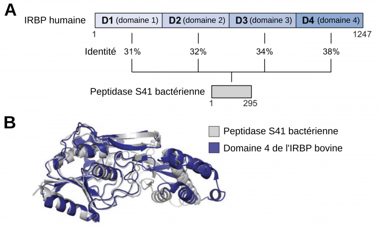 Dans tout l’arbre du vivant, les protéines les plus similaires à l’IRBP des Vertébrés sont une classe de protéines bactériennes appelées peptidases (similarité en acides aminés de 35 %). IRBP possède en fait 4 domaines dont la structure tridimensionnelle est très proche de celle des peptidases.