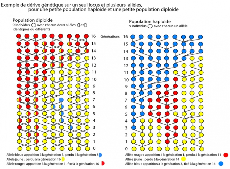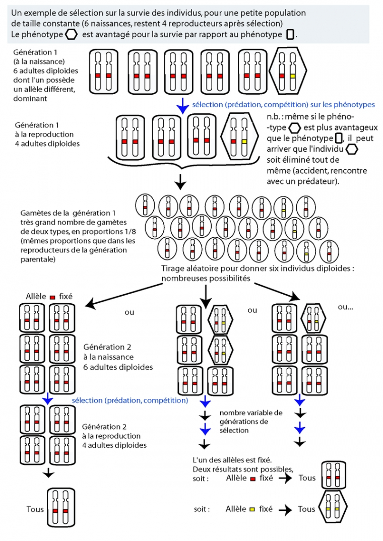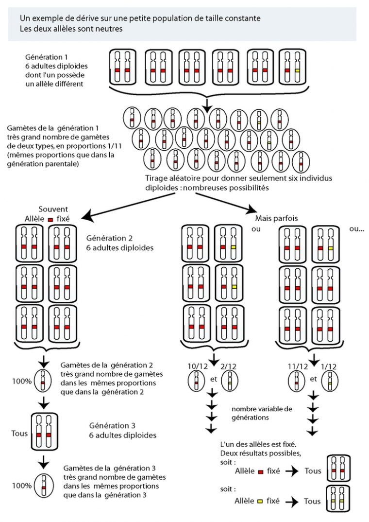À chaque génération, si les descendants sont croisés entre eux (ce qui est le cas dans une population), ce processus se répète, et au bout d'un nombre variable de générations, l'un des deux allèles sera complètement et définitivement éliminé, et tous les individus seront porteurs de l'autre (voir figures 1 et 2 ). À ce moment, le seul allèle restant est dit fixé, et comme c'est le seul présent, tous les descendants en seront porteurs. Mais tôt ou tard de nouvelles mutations se produisent, créant ainsi de nouveaux allèles, et le processus se répète. La probabilité de fixation est (en moyenne) fonction de la proportion de chacun des allèles dans la population de départ. Un allèle présent en un seul exemplaire a donc une probabilité de fixation qui est fonction de la taille de la population : si la population est de deux individus diploïdes, la proportion représentée par l’allèle est de 1/4. Si par contre la population est de mille individus diploïdes, il n’est présent que dans une proportion de 1/2000…