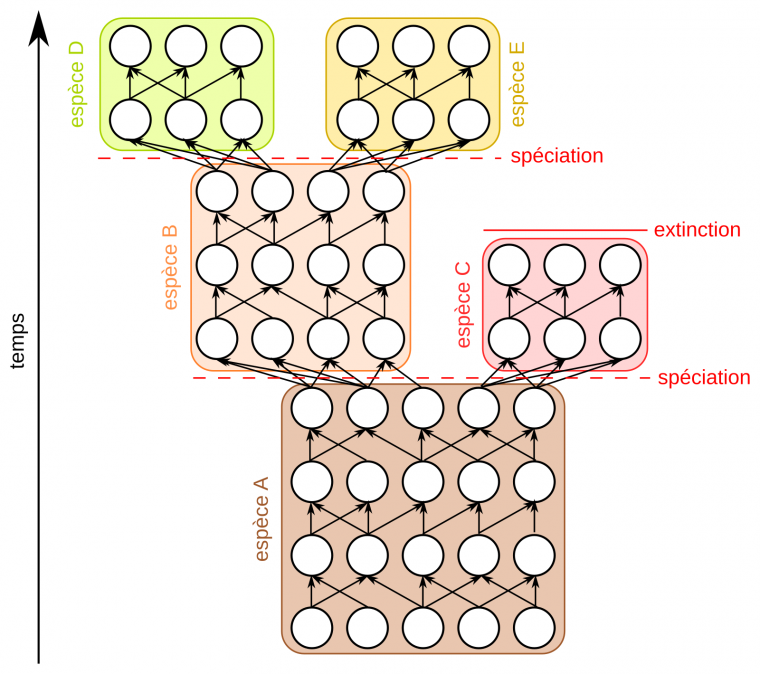 Chaque rond représente un individu. Les flèches représentent les liens de parenté entre individus. Si deux populations ne peuvent plus se reproduire, on considère qu’il y a formation de deux nouvelles espèces.
