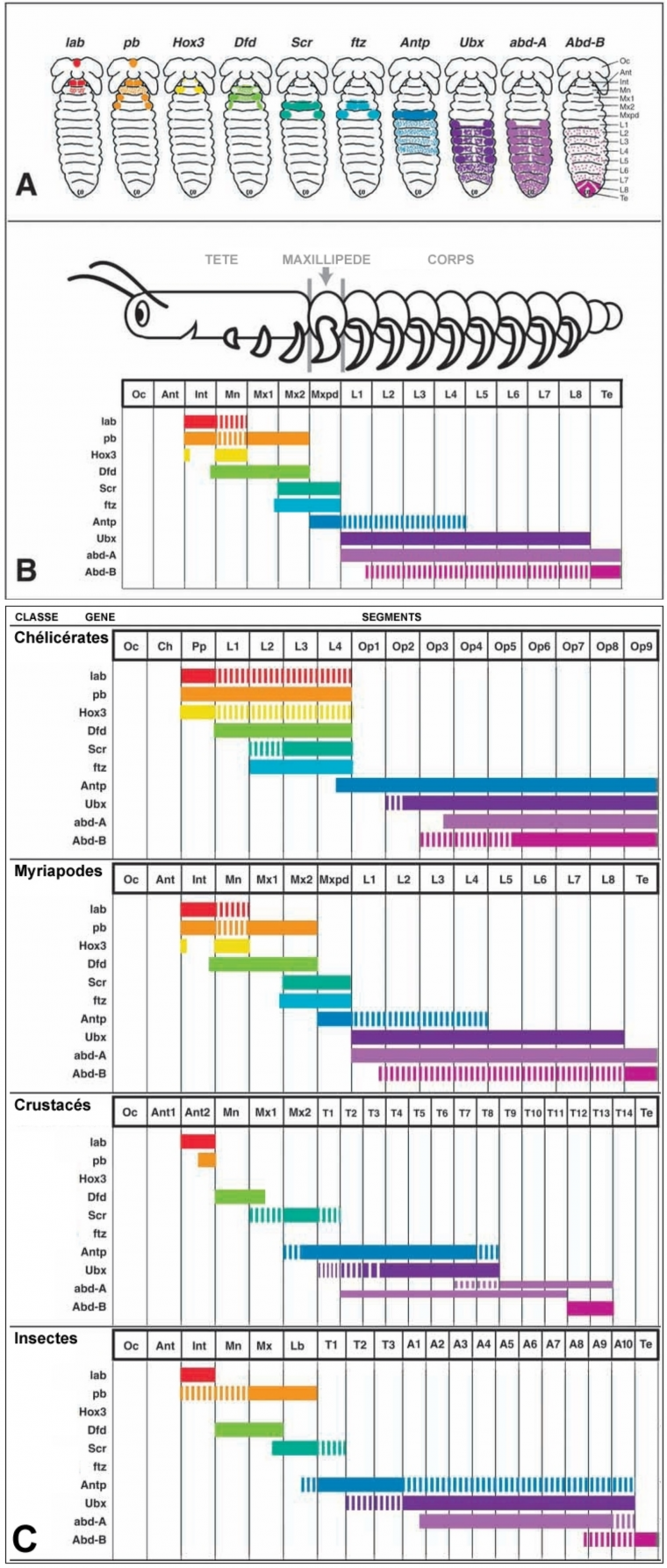 (A) et (B) Patrons d'expression de dix gènes Hox chez les Centipèdes (Arthropodes Myriapodes) présenté sur un schéma d'embryon (A) et sous forme de diagramme (B). (C) Patron d'expression de dix gènes Hox chez différents sous-embranchements d'Arthropodes. Les différentes espèces d'Arthropodes ont souvent un nombre différent de segments. Les diagrammes présentés sont basés respectivement sur les araignées Cupiennius et Achaearanea (Chélicérates), le centipède Lithobius à l'éclosion (Myriapode), le cloporte Porcellio (Crustacé) et le lepisme Thermobia (Insecte).