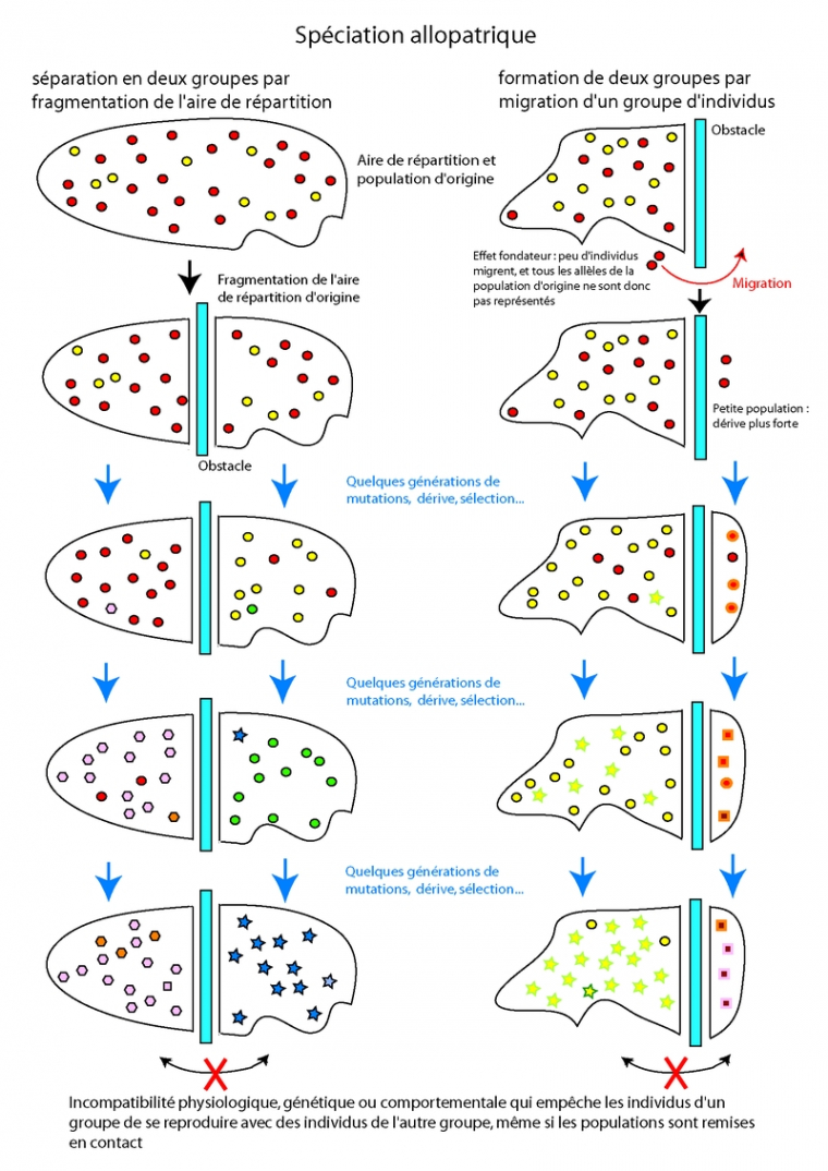 La spéciation allopatrique est probablement la plus courante. Elle se produit entre des populations qui ont été isolées dans l’espace, par fragmentation de l’habitat (une zone de distribution est séparée en deux par l’apparition d’un obstacle) ou migration, et qui du fait de ces obstacles ne peuvent plus échanger de matériel génétique. Cet isolement reproductif du à des circonstances externes permet une évolution indépendante et une divergence des populations, qui finissent par acquérir un isolement reproductif intrinsèque (l’interfécondité étant compromise par une ou plusieurs différences morphologiques, génétiques ou comportementales).Voir fig. 5.