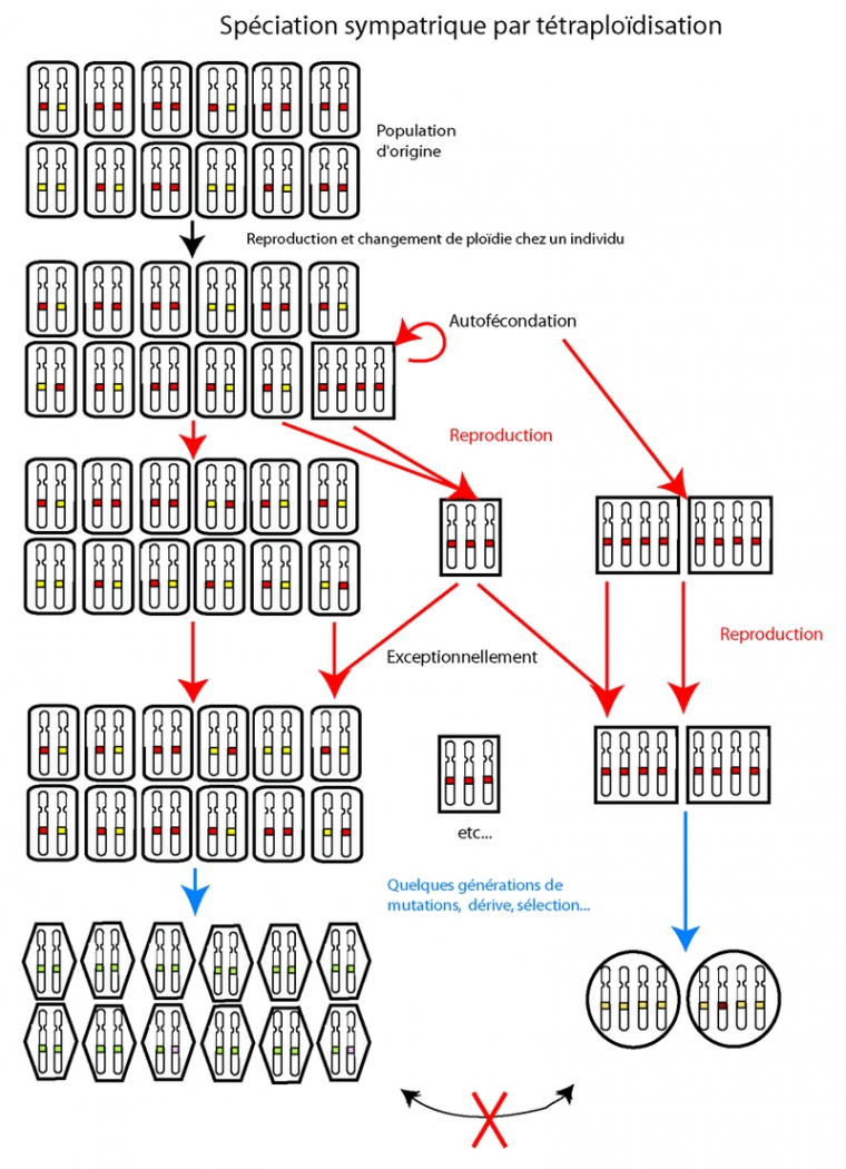 La spéciation sympatrique se fait par apparition d’une nouvelle espèce sur une aire de répartition chevauchante avec celle de l’espèce d’origine. Ce type de spéciation suppose qu’une barrière intrinsèque à la reproduction se mette en place très rapidement, puisque les deux groupes sont en contact. Les changements de ploïdie, par exemple, peuvent servir de telles barrières (un tétraploïde qui apparaît dans une population diploïde, par exemple). Dans les cas d’hybrides de parents avec des nombres chromosomiques différents, une tétraploïdisation (allotétraploïde) peut permettre la survie et la fertilité de l’hybride. Un certain nombre d’exemples existent chez les plantes à fleur et les fougères actuelles (certains chercheurs ont estimé qu’ils sont responsables de 2 à 4 % des événements de spéciation chez les plantes à fleur, et de 7% chez les fougères ; Otto et Whitton 2000). L’un des problèmes rencontrés par les polyploïdes nouvellement formés est le manque de partenaires pour la reproduction : un croisement entre un individu diploïde et un individu tétraploïde donnera des triploïdes, qui ont généralement une fécondité très réduite du fait de problèmes de ségrégation des chromosomes. Il arrive cependant que les triploïdes produisent des gamètes euploïdes (haploïdes, diploïdes et triploïdes) en très faible proportion. Ils peuvent alors produire avec l’individu tétraploïde quelques descendants tétraploïdes ; les organismes capables d’autofertilisation peuvent également contourner ce problème. La polyploïdisation peut produire des changements importants dans la morphologie. Voir fig. 6.