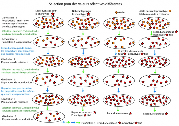 Pour la discussion sur la dérive, les deux allèles étaient considérés comme étant de valeur équivalente pour les individus. Mais bien que cela soit souvent le cas, il arrive également que le nouvel allèle donne un produit moins efficace (ou, plus rarement, plus efficace) que l'allèle dont il est issu. La probabilité de fixation d'un allèle avantageux est augmentée par rapport à celle de l'allèle avec lequel il est en « compétition ». Ce qui est important, c'est non seulement le taux de survie, mais également le nombre de descendants laissé. Les chercheurs en génétique des populations ont introduit pour cela la notion de fitness des individus. Ce paramètre, également appelé valeur sélective, prend en compte non seulement la probabilité de survie des individus, mais également leur capacité de reproduction, c'est-à-dire de transmission de l'allèle d'intérêt à la génération suivante. Un variant a beau être extrêmement avantageux, s'il ne transmet pas la variation à la génération suivante, il n'aura pas d'impact sur l'évolution à long terme de sa population ou de son espèce.