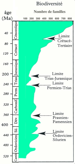 Un grand nombre d’extinctions se sont produites au cours de l’histoire des êtres vivants. Nombre d'entre elles ont été retenues comme marqueurs des limites entre les différentes ères géologiques (voir fig. 7). Nous vivons actuellement la sixième grande extinction.