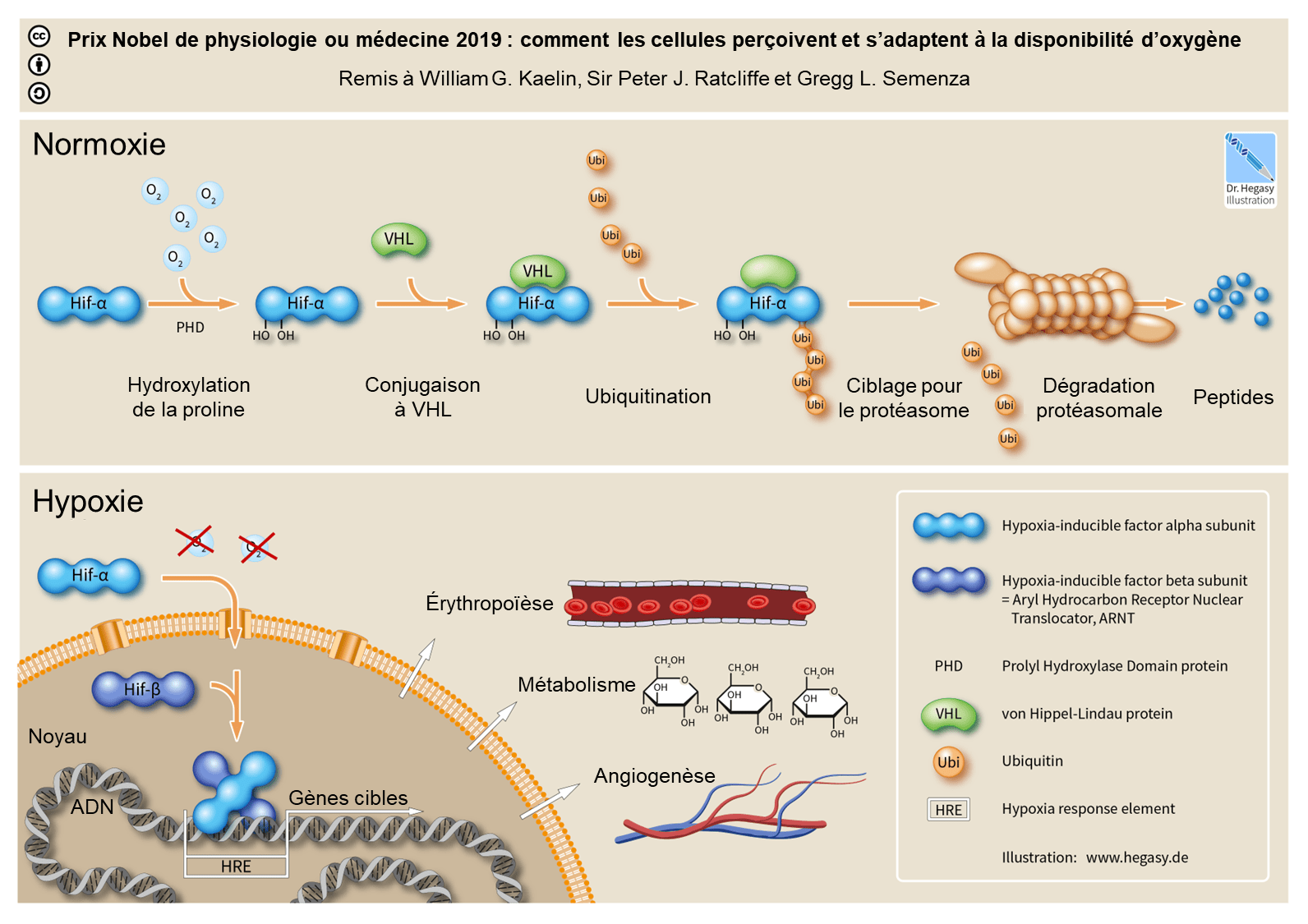 En cas d’hypoxie, la sous-unité HIF-α n’est pas hydroxylée et n’est donc pas dégradée. HIF-α se déplace alors vers le noyau cellulaire et s’associe à la sous-unité HIF-β ainsi qu’à d’autres cofacteurs. Le facteur de transcription HIF, au complet, se lie à des séquences régulatrices appelées HRE (Hypoxia Response Element) ce qui permet l’activation des gènes cibles. Cela déclenche diverses réponses dans l’organisme telles que l’érythropoïèse (production de globules rouges), la glycolyse (permettant la production d’ATP malgré l’absence de dioxygène) ou l’angiogenèse (formation de nouveaux vaisseaux sanguins) pour pallier au manque de dioxygène 2.