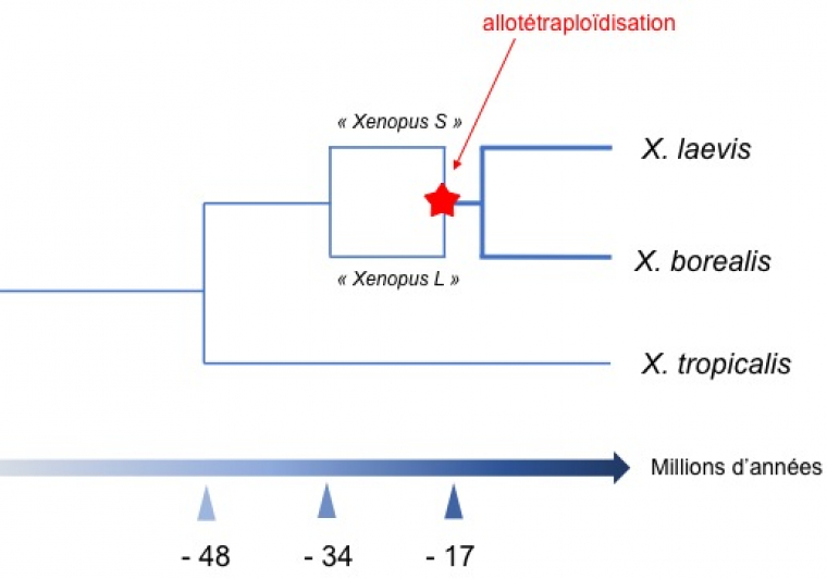 Le dernier ancêtre commun entre les deux espèces de Xenopus les plus utilisées dans les laboratoires, X. laevis et X. tropicalis, a vécu il y a 48 millions d’années. Un épisode de spéciation il y a 34 millions d’années a produit les deux espèces dites S et L qui se sont ensuite hybridées et ont donné une descendance fertile il y a 17 millions d’années. Un dernier épisode de spéciation a eu lieu peu après donnant naissance à X. laevis et à X. borealis, toutes deux allotétraploïdes.