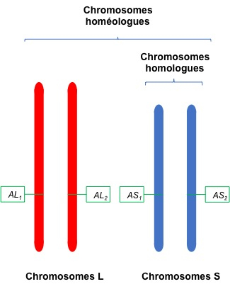 Chaque gène (ici le gène A) peut être présent en 4 exemplaires (tétraploïdie) sur deux jeux de chromosomes homologues provenant de 2 espèces différentes (chromosomes homéologues).