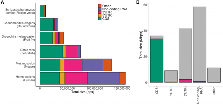A. Comparaison, chez six organismes, de la proportion de bases situées dans des exons et annotées en tant que séquence codante (CDS), 5'UTR, 3'UTR, ARN non codant et autre (incluant les éléments transposables et les pseudogènes).