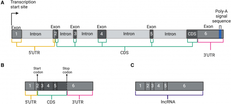 5'UTR : extrémité 5' non traduite ; CDS : séquence codante ; 3'UTR : extrémité 3' non traduite ; lncRNA : long ARN non codant.