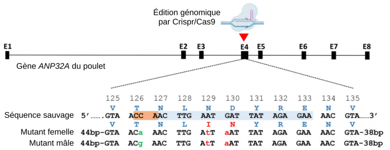 Deux changements de nucléotides (lettres rouges) dans la séquence codante d’ANP32A introduisent des mutations faux-sens de l’asparagine (N) en position 129 (N129I) et de l’acide aspartique (D) en position 130 (D130N), inhibant l’interaction de la protéine du poulet avec les protéines virales. Le troisième changement de nucléotide (lettres vertes) est une mutation synonyme qui sert de marqueur de contrôle pour la contribution allélique des hôtes mâles et femelles.