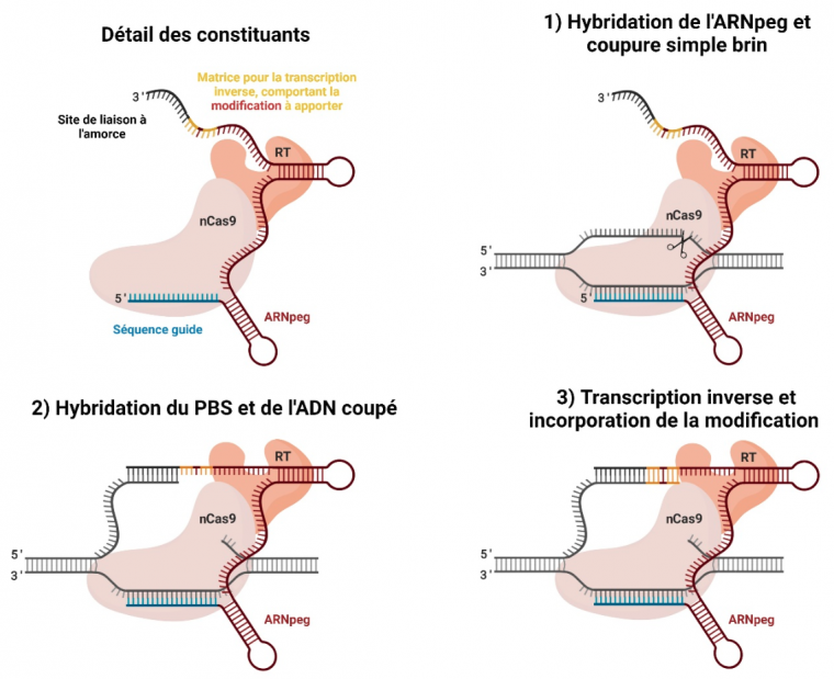 La réécriture par matrice d’ARN est un système permettant de réaliser de petites substitutions de nucléotides sans impliquer la voie de recombinaison homologue (Figure 2). Cette technologie utilise une protéine de fusion entre une Cas9 mutante, réalisant uniquement une coupure simple brin (Cas9 nickase ou nCas9), et une transcriptase inverse (RT, pour reverse transcriptase) permettant de copier la modification voulue au niveau de la séquence cible. Aucune matrice d’ADN n’est nécessaire pour réaliser la modification puisque l’ARN guide modifié, nommé ARNpeg (pour prime editing guide) est un ARN « trois-en-un », contenant les domaines suivants :
