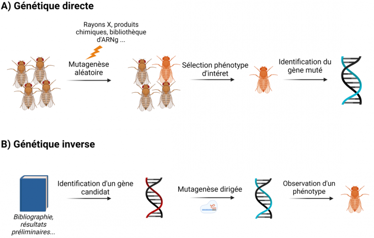 En génétique directe (A), on part sans à priori et l’on déduit le gène impliqué dans une fonction grâce au phénotype observé sur un mutant d’intérêt. En génétique inverse (B), on sélectionne préalablement un candidat à l’aide de données préliminaires, que l’on mute spécifiquement pour observer ensuite les conséquences de sa délétion. Réalisé à l’aide de Biorender.