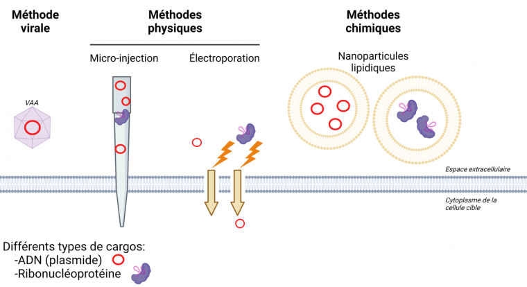 De nombreuses méthodes de transfert ont été développées et sont utilisées selon les contextes cellulaires. Dans le cas des vecteurs viraux, une partie du génome viral est remplacée par une séquence exprimant la Cas9 et une autre exprimant l’ARN guide 2. Cette méthode est très efficace puisque les mécanismes de transfert du matériel génétique des virus ont été optimisés par l’évolution. Les virus adéno-associés figurent parmi les vecteurs viraux les plus employés, car ils sont peu immunogènes et ont la particularité de ne pas s’intégrer dans le génome de l’hôte, permettant une expression transitoire de la machinerie d’édition génomique 3.