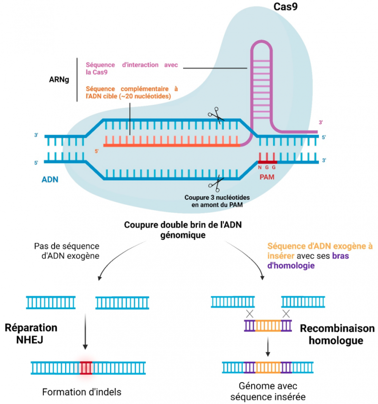 Détail du complexe Cas9/ARNg fixé sur sa séquence cible d’ADN. Après coupure double brin trois nucléotides en amont du motif PAM, deux mécanismes sont possibles. La réparation non homologue (NHEJ pour Non Homologous End Joining) induit des mutations aléatoires de type insertion ou délétion (indels). Si l’expérimentateur introduit une séquence avec des bras d’homologie, elle sera utilisée pour réparer la cassure et sera intégrée dans le génome par recombinaison homologue. Réalisé à l’aide de Biorender.
