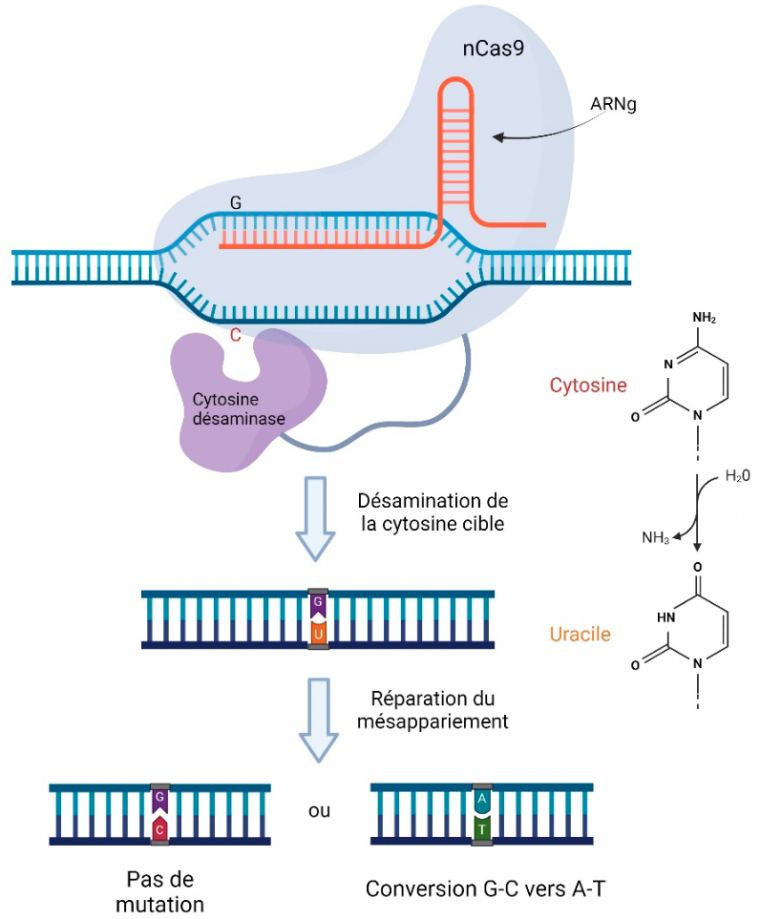 Après recrutement de la Cas9 fusion à la séquence cible, l’enzyme (ici, la cytosine désaminase) modifie chimiquement une base, conduisant à la modification voulue. Réalisé à l'aide de Biorender.