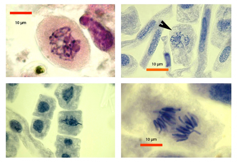 Les images suivantes des différentes phases de la mitose ont été obtenues avec des pointes de racine d’échalote colorées par le jus de myrtille.