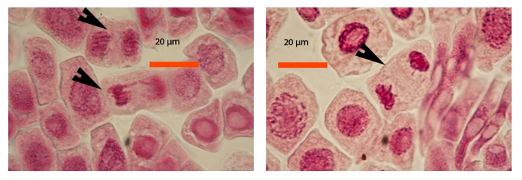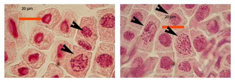 A gauche : noyaux en interphase (flèche du haut) et prophase (flèche du bas)