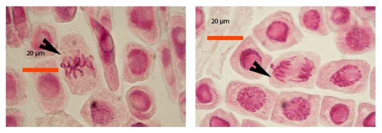 - Pour observer les différentes étapes de la mitose, on conseille l’utilisation de racines d’échalotes (Allium cepa L. var. aggregatum). L’échalote grise (cv. Mikor) germe rapidement (racine obtenues en environ 2 jours).