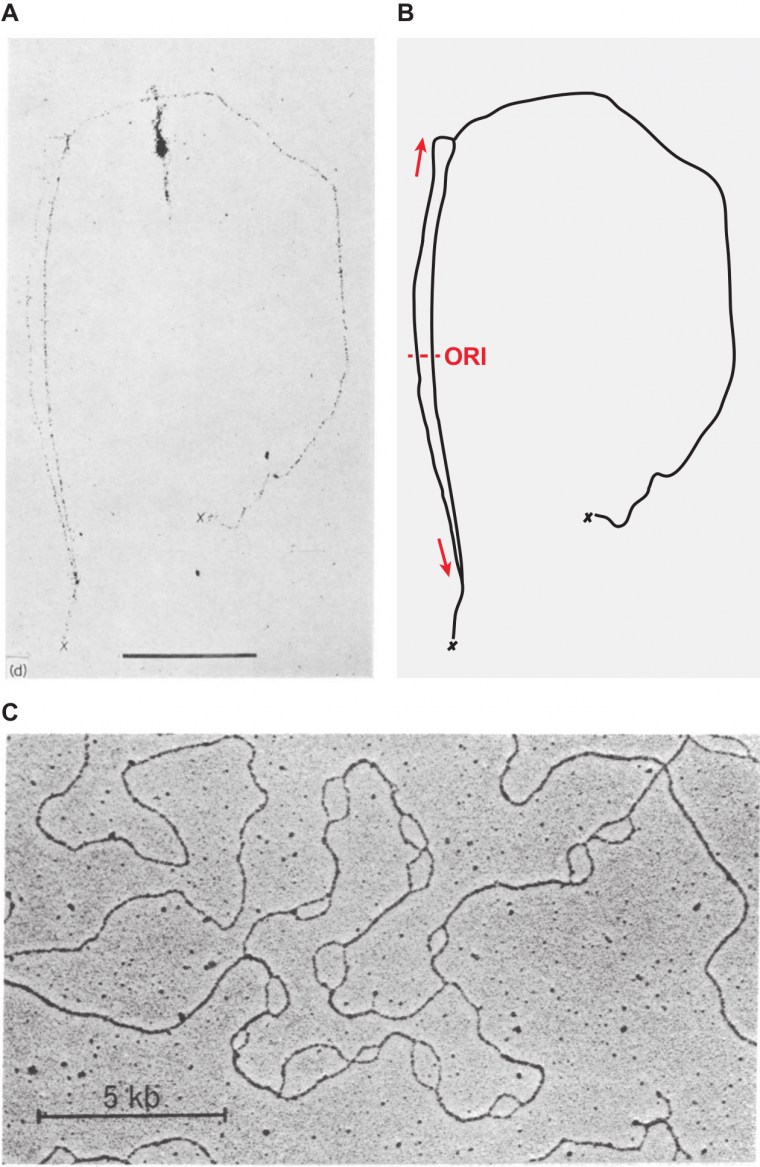 (C) Visualisation par microscopie électronique d’un chromosome de drosophile en cours de réplication. Les régions répliquées apparaissent sous la forme de « bulles » correspondant chacune à une paire de fourches de réplication divergentes.